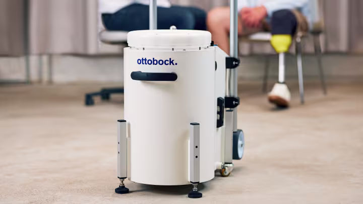Instead of plaster, resin-impregnated lumeo casting socks are used to take the impression. They are moulded under full load with hydrostatic pressure and cure under UV light at the touch of a button.
