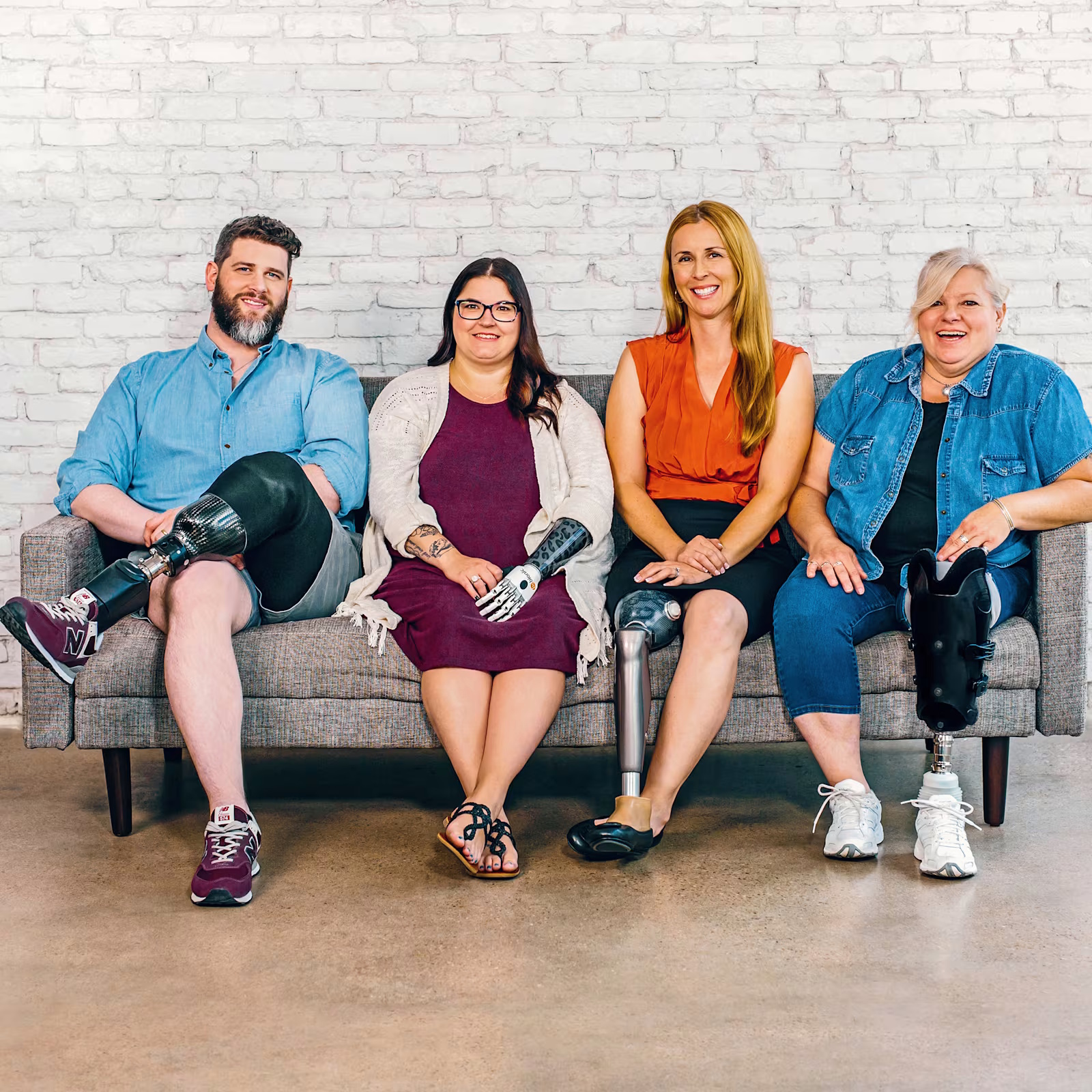 Four people sitting on a bench. A man with a below the knee prosthetic leg, a woman with a bebionic hand, a woman with a C-Leg prosthetic knee joint and a woman with a trans-tibial prosthesis.
