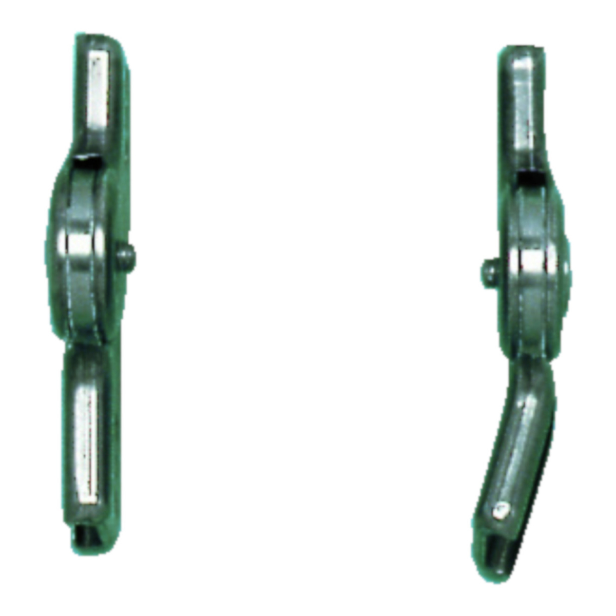 Stainless steel Medial joint has contoured lower bar and straight upper bar, straight lateral joint, free motion, with ball bearing. Joint center 16 mm to the posterior.