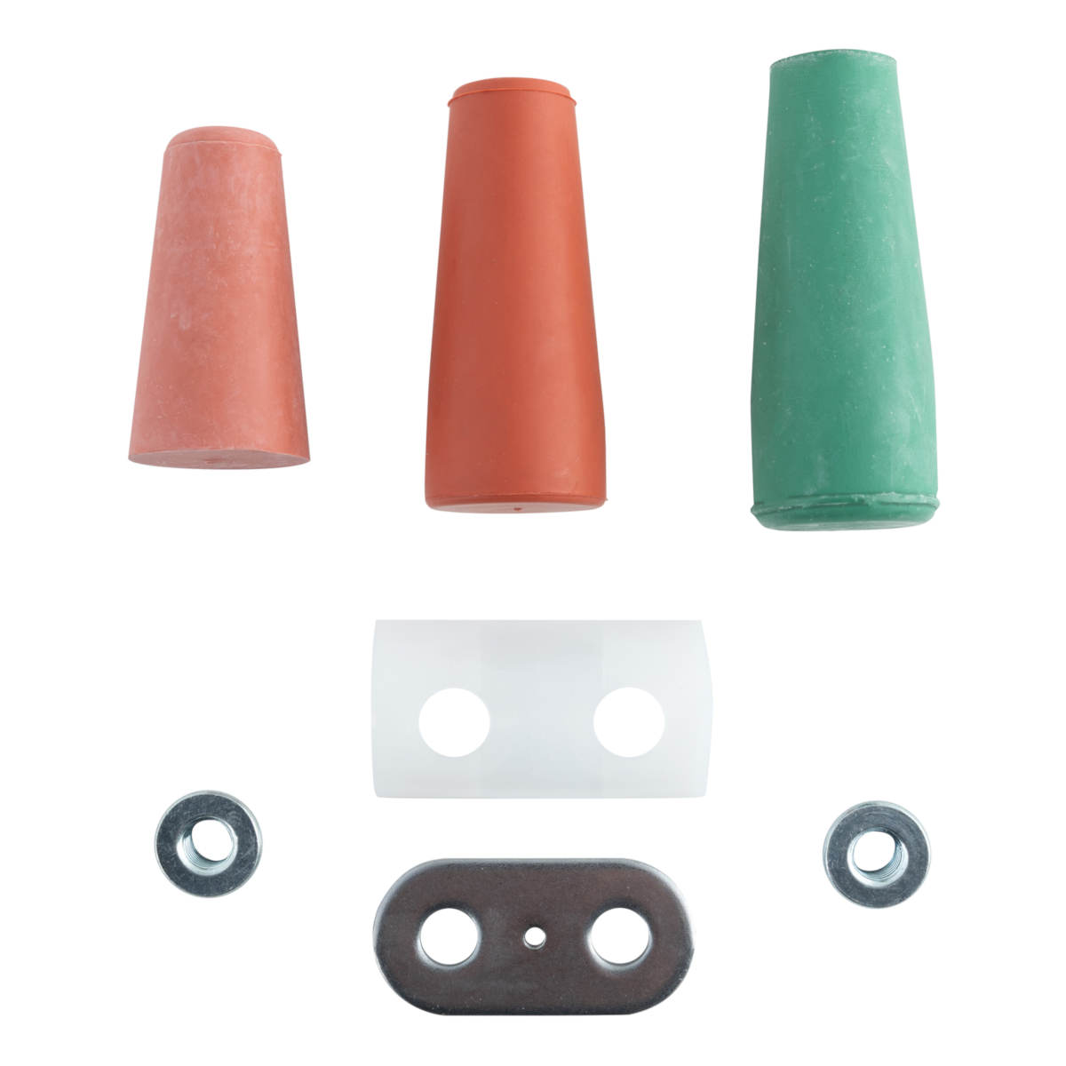 1 lower bearing shell, 2 rubber bumpers (hard, medium, soft), 1 base plate, 2 hexagon nuts