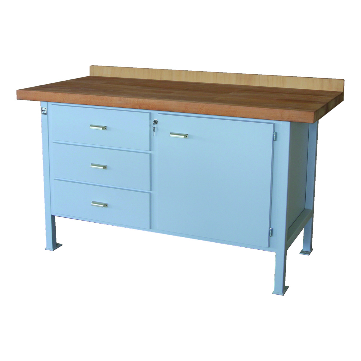 Workbench top made of parqueted red beech wood, chassis made of square section steel 40x40x2 mm, drawers made of red beech, three drawers on left, 150 mm high, shelf with swing door on right