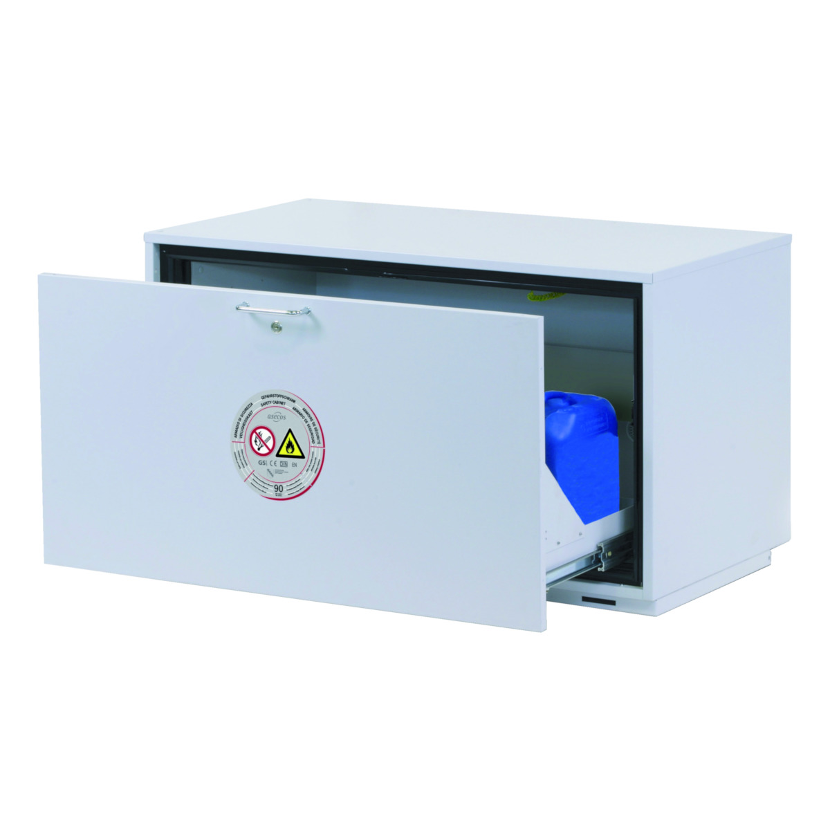 According to DIN 12925, Part 1 (4/1998), fire grading period (FGP) of 90 minutes, for storing inflammable liquids and solid materials at the workplace in the sense of TRbF 22 (engineering rules for storing flammable liquids in security storage cabinets). In addition, this security storage cabinet has been tested by the DEKRA (Certification Services, Stuttgart) according to the safety regulations for appliances. Steel cabinet with high-quality plastic coating, multilayer sandwich construction using Class A insulation material in compliance with DIN 4102, with new drawer technology. Features drawer technology with a locking technique that allows the drawer to be locked in any position. Therefore, vessels can be put in or taken out according to ZH 1/119 using both hands. In the event of a fire, the drawer is closed automatically by means of a thermal triggering system. The inner surfaces of the cabinet are corrosion and impact resistant. The exhaust stud connection has a nominal width of 75 mm and is located at the rear of the cabinet 335 mm from the top and 300 mm from the right side. The cabinet support consists of a base, height 30 mm.