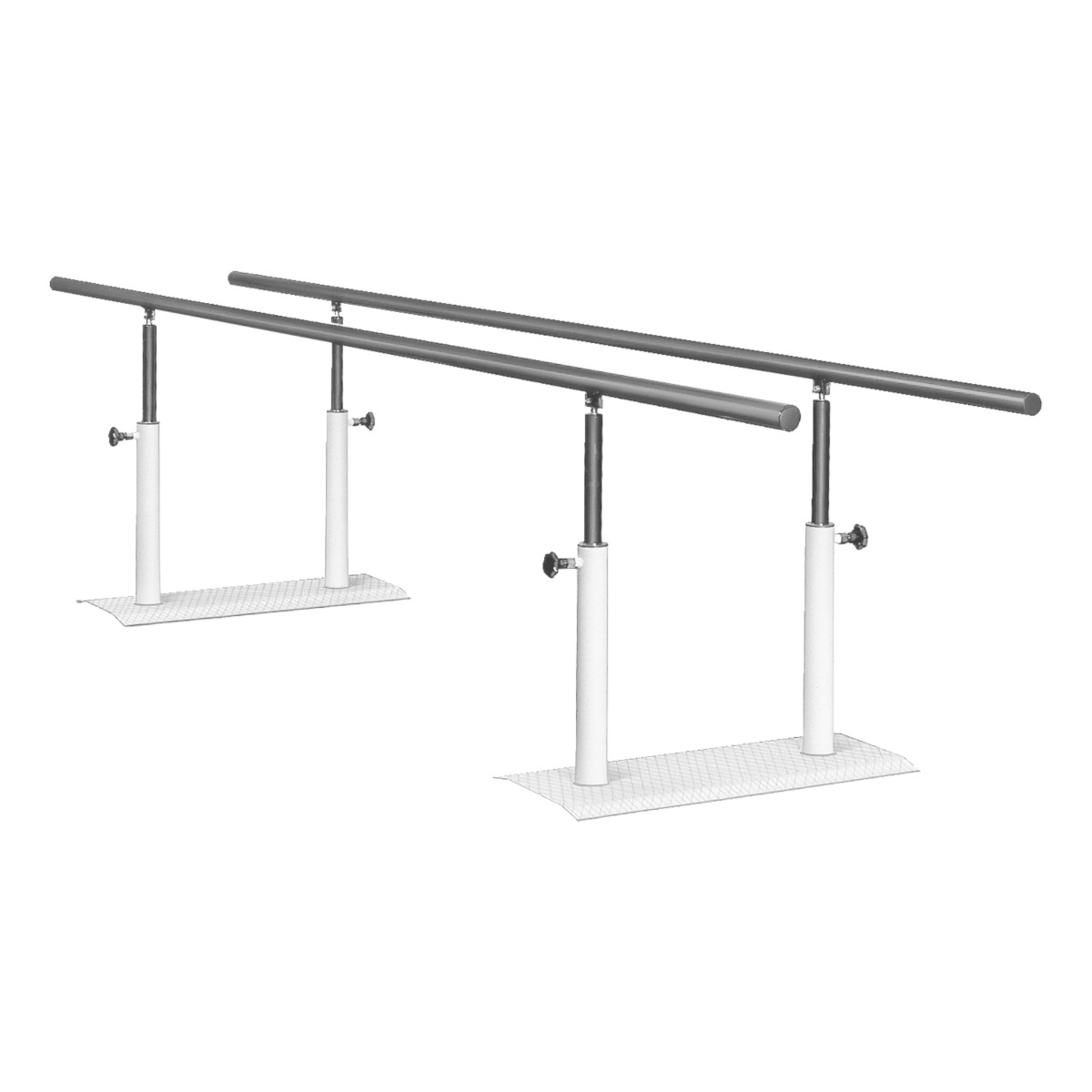 Adjustable height and width, flat base plates, collapsible rails. To be used for Freestanding set-up; when not used, the parallel bars can be folded up and put to the side