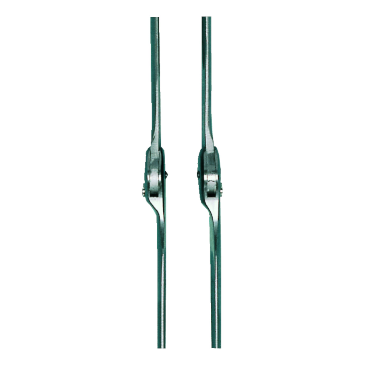 Stainless steel joints with ball bearing, concave half-round bar profile, forged upper and lower joint bars and the head of the inner joint bar is offset to the outside, the head of the outer joint bar to the inside.