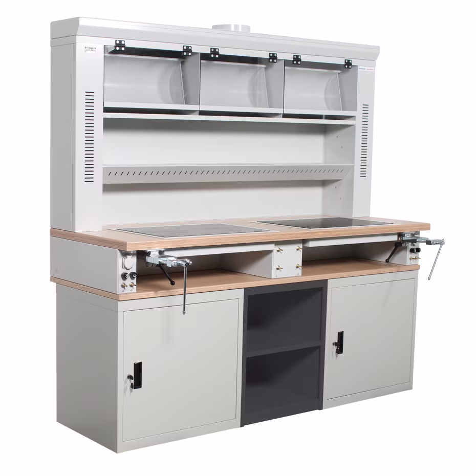 Ce poste multifonctions dédié au coulage et à la stratification est parfaitement équipé pour fabriquer, de façon efficace, des dispositifs orthopédiques tels que des emboîtures en résine de coulée. Reliées à une installation d’aspiration centrale ou équipées d’un extracteur auxiliaire antidéflagrant, les fentes d’aspiration intégrées et l’aspiration continue au niveau des bords du plan de travail assurent à chaque instant une sécurité maximum. Les bras d’aspiration disponibles en option permettent, en outre, d’aspirer immédiatement les vapeurs là où elles se forment.